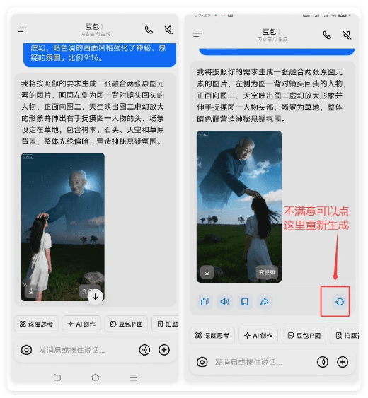 用AI修复老照片,让老照片动起来,半透明人托梦等AI制作来寄托思念。最近一组 AI 合成的去世亲人摸头照片在抖音获得 41.7万点赞。画面中,逝者温柔地抚摸着亲人的头,那熟悉的眼神、温暖的动作,仿佛从未离开。制作起来很简单,豆包APP就可以搞定。