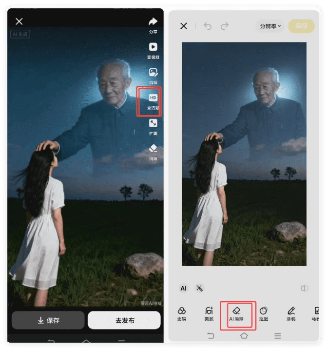 4.满意的图片点击图片放大—变清晰—保存手机—手机相册自带的编辑里有AI消除(安卓手机基本都支持)——可以消除左上右下角的水印