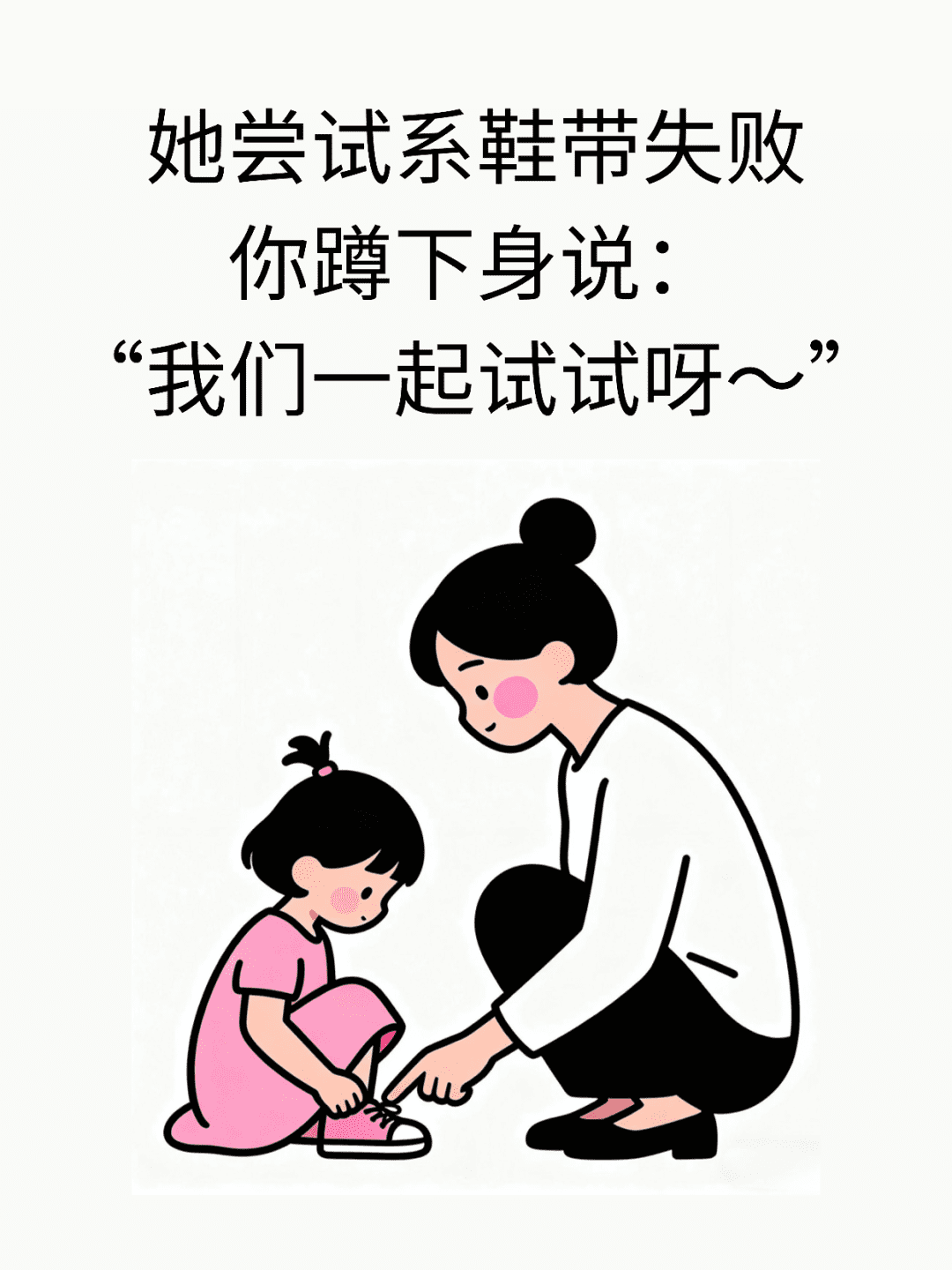 扁平风格卡通插画,纯白色背景,扎黑色发髻穿白色长袖上衣的女性脸颊淡粉色红晕(妈妈),穿粉色连衣裙小女孩扎小翘辫(女儿),线条简洁流畅,色彩明快柔和,低饱和度,无阴影,极简构图,动作:妈妈蹲下与女儿平视,手指向鞋带,女儿低头看向鞋子
