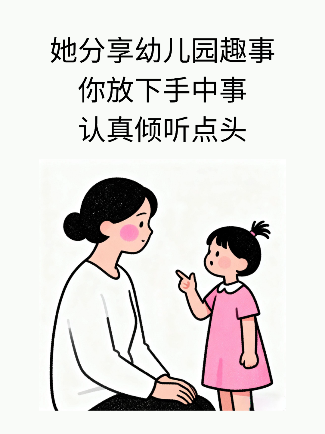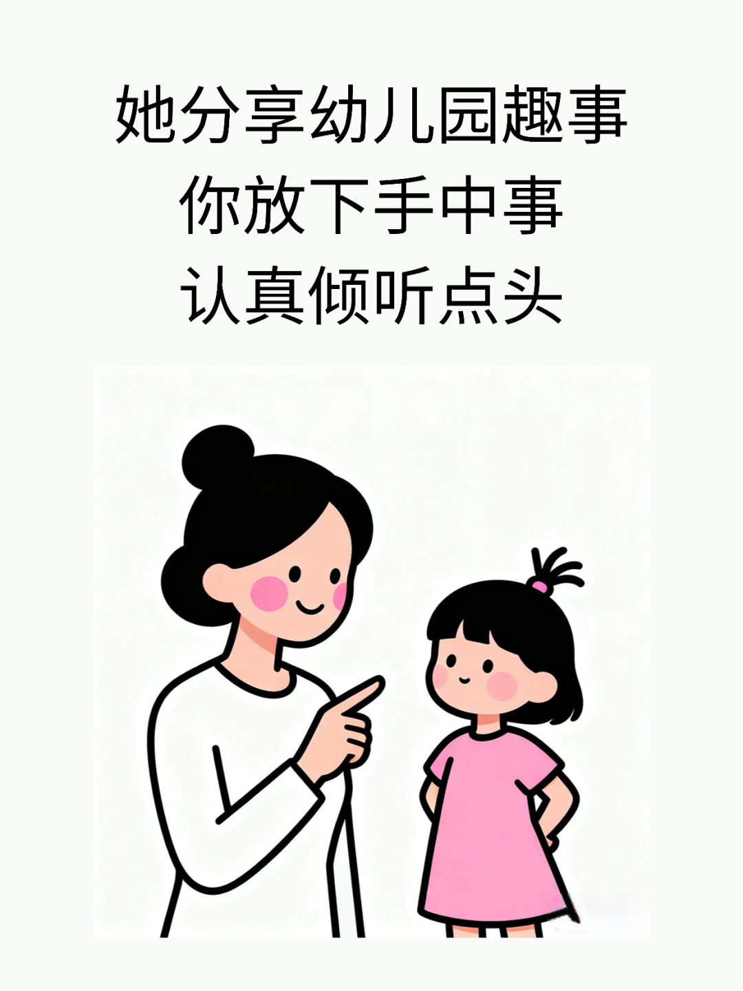 同上固定风格,动作:妈妈侧身坐直,双手放在膝盖上倾听,女儿站着比划讲述