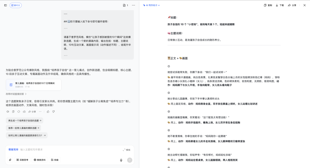 直接丢给 AI,让它按照“让孩子感到被爱的 10 个瞬间”的方向,生成 10 个可落地的选题。