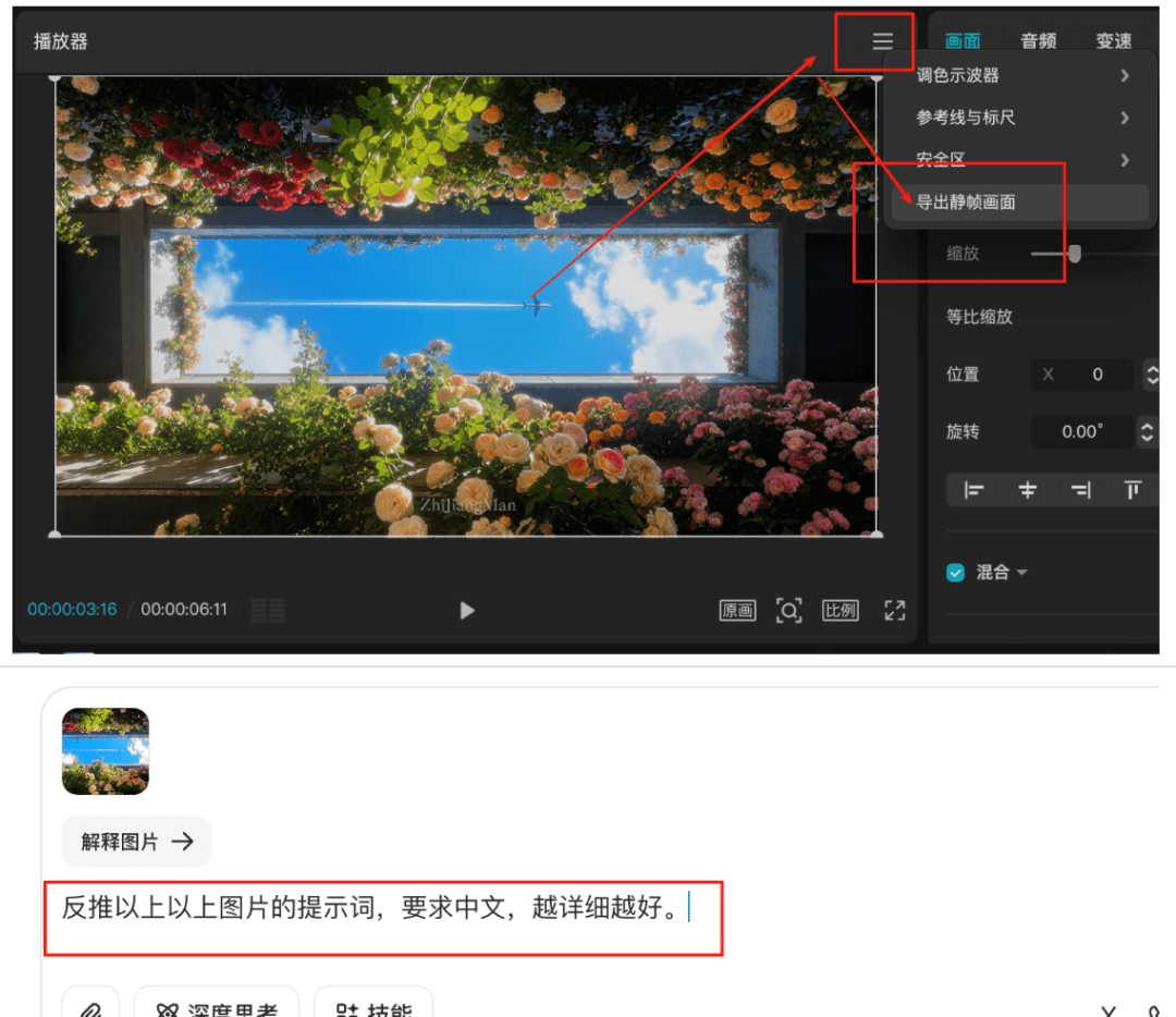 大家看完这个视频案例之后,肯定感觉这类视频那么简单,为什么还会有那么好的流量呢?即使有流量,那怎么变现呢? 下面先说下变现吧,这类视频常规的变现方式也很简单: 1、流量分成 2、橱窗带货 3、引流私域收徒变现 第一步:生成提示词 大家可以先找到对标视频,然后将对标视频的画面在剪映中导出静态画面,再通过豆包反推提示词。如下图所示,上图是在剪映中导出静帧画面,下图是在豆包中反推提示词。