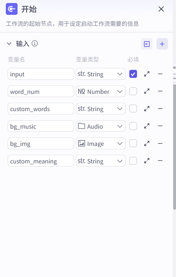 名称:开始节点功能:工作流的起始节点,用于设定启动工作流需要的信息,包括词根(必填)、单词数量、自定义单词、背景音乐、背景图片等参数。2. 查询数据节点