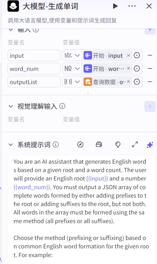 3: 大模型 – 生成单词节点,关联关系: 接收开始节点的词根、单词数量和查询数据节点的已存在单词列表,生成新单词数组,传递给代码_处理单词列表节点步骤