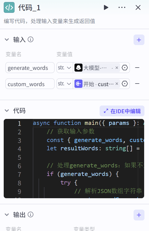 4: 代码_处理单词列表节点,关联关系: 接收大模型 – 生成单词节点的新单词数组和开始节点的自定义单词,处理后输出最终单词列表,传递给大模型 – 生成口播文案节点步骤