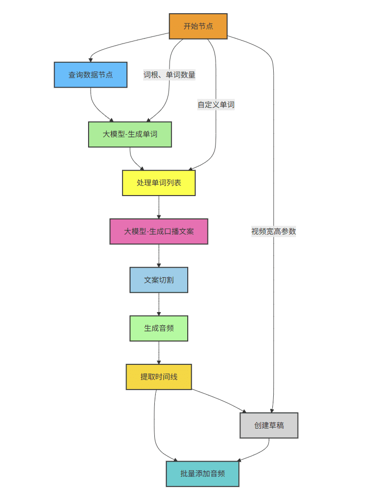 随后根据是否有自定义单词进行分支判断,若有则直接使用,若无则从数据库查询相关数据并调用大语言模型生成单词。接着再次调用大语言模型生成口播文案,将文案进行切割处理后循环合成音频,同时提取音频时间线。
