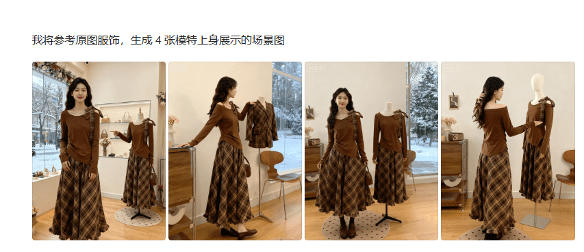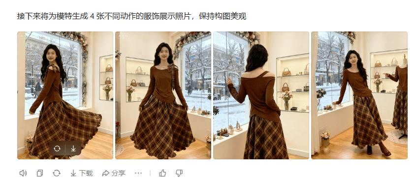 继续对话:“保持人物、衣服、场景一致,再给我 4 个不同姿势”,AI 会生成走路、侧身、抬手、回眸等动作,完全不用重新写提示词。
