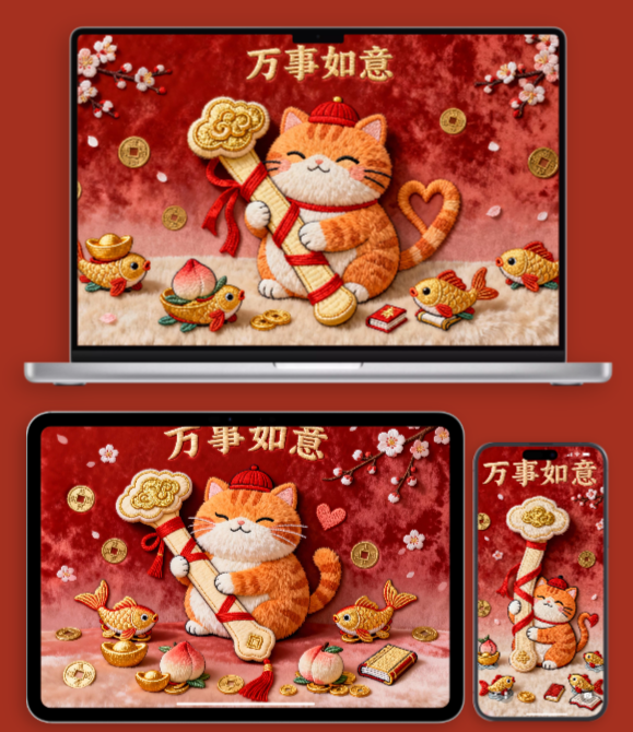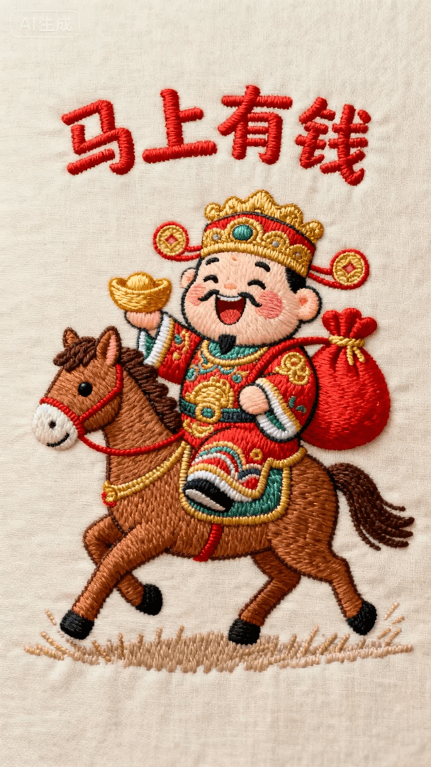 壁纸设计,整体立体刺绣,整体毛绒质感,萌系,简约风,高级感,画面顶部显示“马上有钱”四个字,特别字体。一只马,背上驮着财神爷,形象胖乎乎的十分可爱。财神爷穿着华丽的服饰,头戴金冠,手持金元宝,背上背着一个红色钱袋子,脸上洋溢着笑容。马儿迈着轻快的步伐,仿佛在向你走来,带来无尽的财运和好运。整个画面充满喜庆和欢乐的氛围,让人一看就心情愉悦。刺绣针脚纹理细腻逼真,色彩鲜艳饱满,还原手工刺绣的质感与细节。