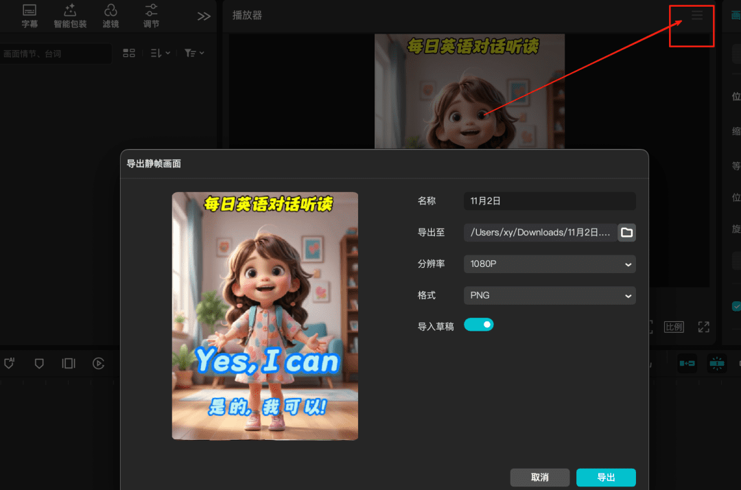 今天就带大家一步一步的来拆解这个视频的制作方法,学会之后,先起号,然后发带货视频,只要坚持半年,每天拿出一个小时时间,相信你也可以把副业变成主业,实现睡后收入! 第一步:生成系列图片 这类视频不需要多炫酷的视频效果,只需要一张图片配一句中英文对照的文案就可以了。前期大家不会自己生成图片,就找对标,先抄,再超,最后实现钞。 比如我今天就对标上面发的这个视频,将视频放到剪映里面,抽取静态帧。依次抽取所有的静态画面,保存到本地。
