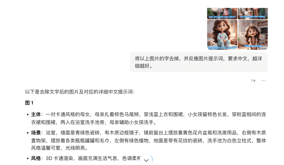 然后将图片扔给豆包,让豆包去掉图片上的字,并反推提示词。如下图所示: