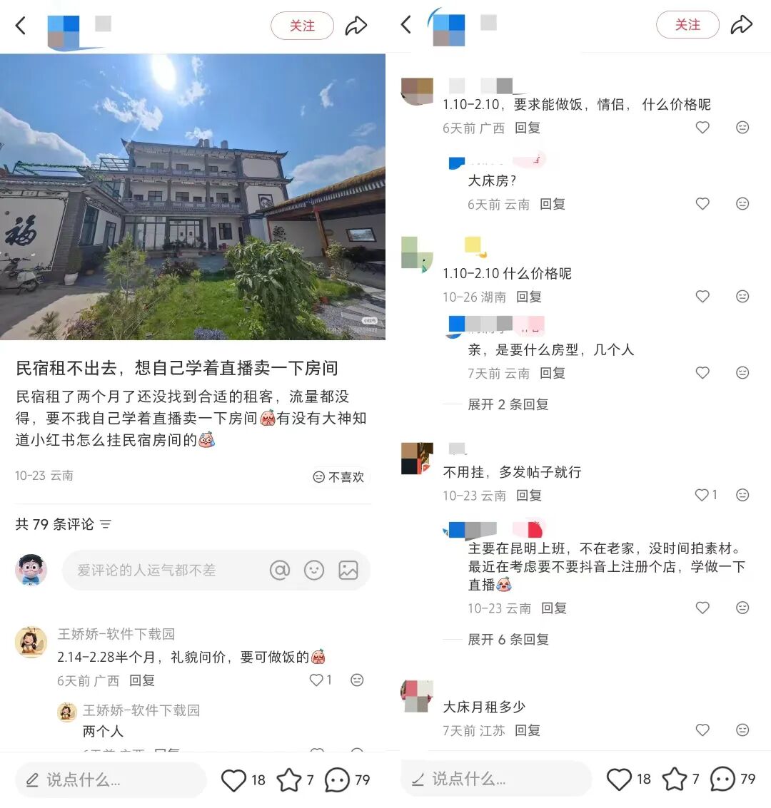 我们再看下面这个做民宿的,也是一样的技巧,说自己民宿租不出去想学着直播卖的看看,然后很多人问价格的。