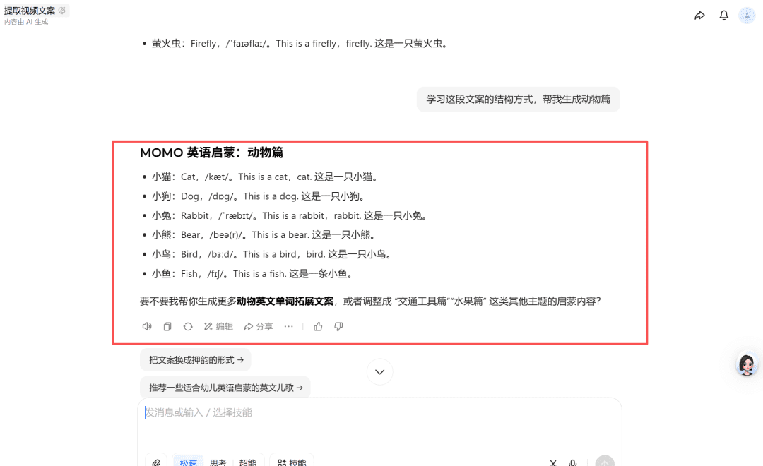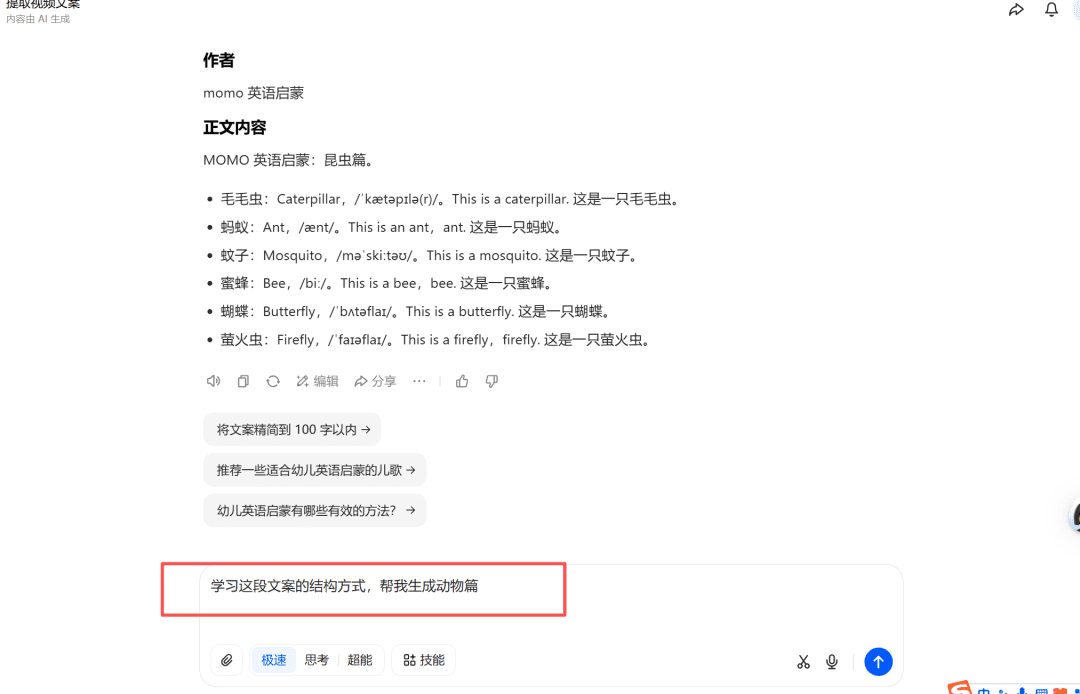 豆包提取视频文案之后,继续输入指令:学习这段文案的结构方式,帮我生成动物篇,让豆包进行邪修创作
