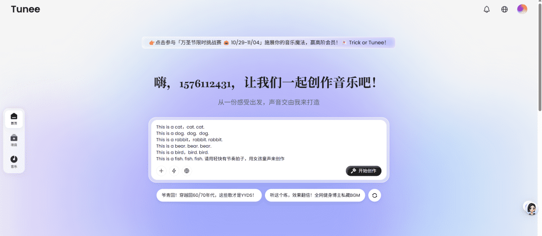 2.音乐生成生成音乐选择suno或者tunee,这边推荐使用tunee制作就可以,它无需魔法,对于小白比较友好网址:https://www.tunee.ai/zh-CN/home输入豆包生成文案让tunee进行歌曲创作