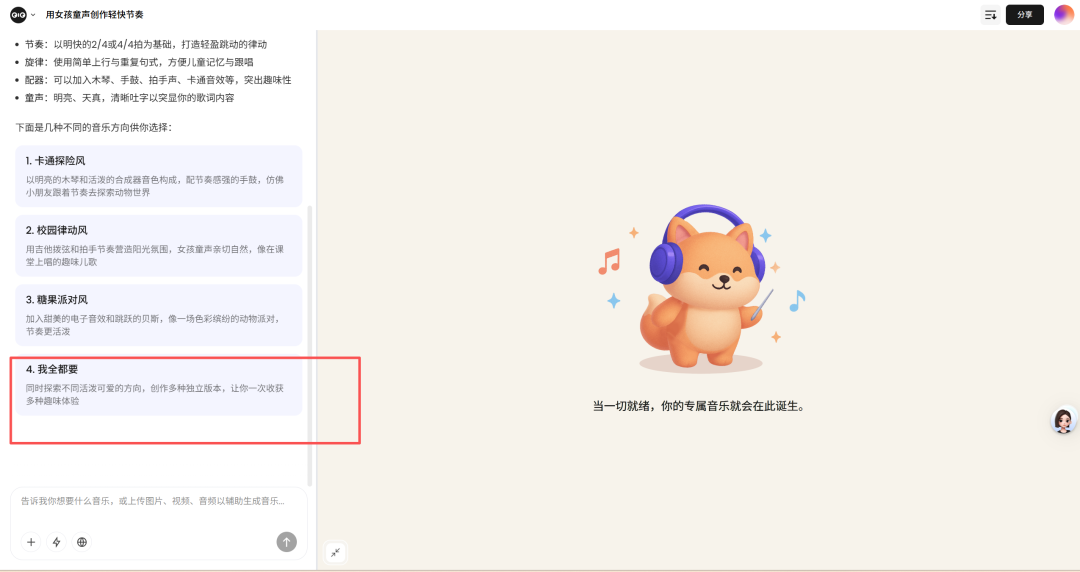 tunee会生成四种类型的歌曲来供我们选择,我选择全部来生成,看哪个类型比较好用那个