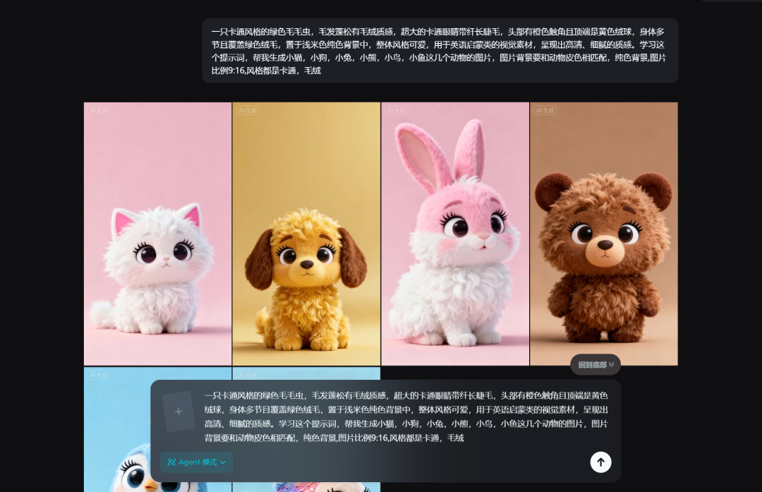 3.图像生成网址:https://jimeng.jianying.com/ai-tool/generate/?type=agentic打开即梦的agent模式,输入提示词:一只卡通风格的绿色毛毛虫,毛发蓬松有毛绒质感,超大的卡通眼睛带纤长睫毛,头部有橙色触角且顶端是黄色绒球,身体多节且覆盖绿色绒毛,置于浅米色纯色背景中,整体风格可爱,用于英语启蒙类的视觉素材,呈现出高清、细腻的质感。学习这个提示词,帮我生成小猫,小狗,小兔,小熊,小鸟,小鱼这几个动物的图片,图片背景要和动物皮色相匹配,纯色背景,图片比例9:16,风格都是卡通,毛绒即梦agent一次性帮我们生成所有ip形象的图片