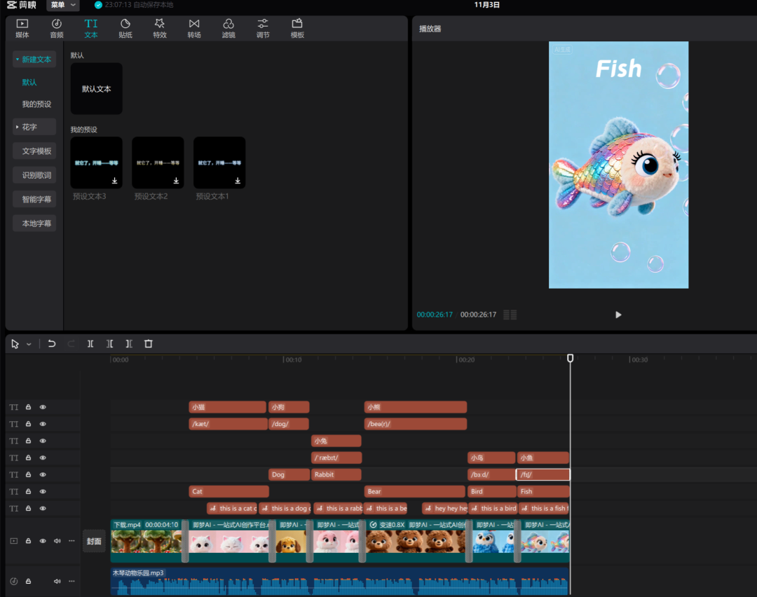 4.打开剪映导入生成的所有视频片段和音频,拖入轨道对齐,视频画面添加合适叠化转场调整字幕的颜色,字体和位置调整文案的排版,颜色和字体
