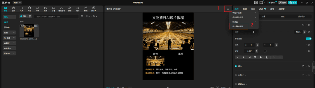 2.拖动时间线,找到你想复刻的那一帧画面,点击右上角 “导出静帧画面”。