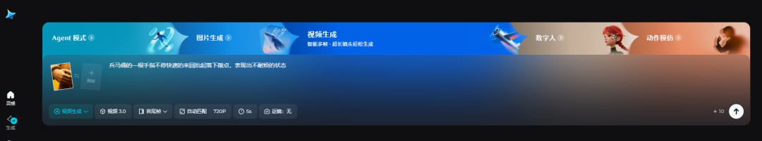 1.切换为视频生成,上传刚刚生成好的图片,输入提示词: