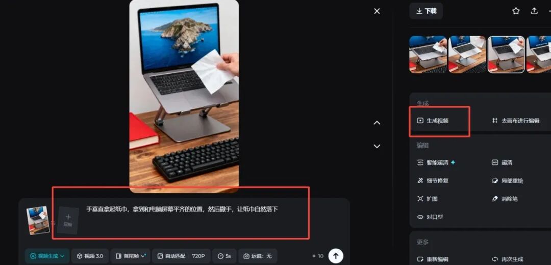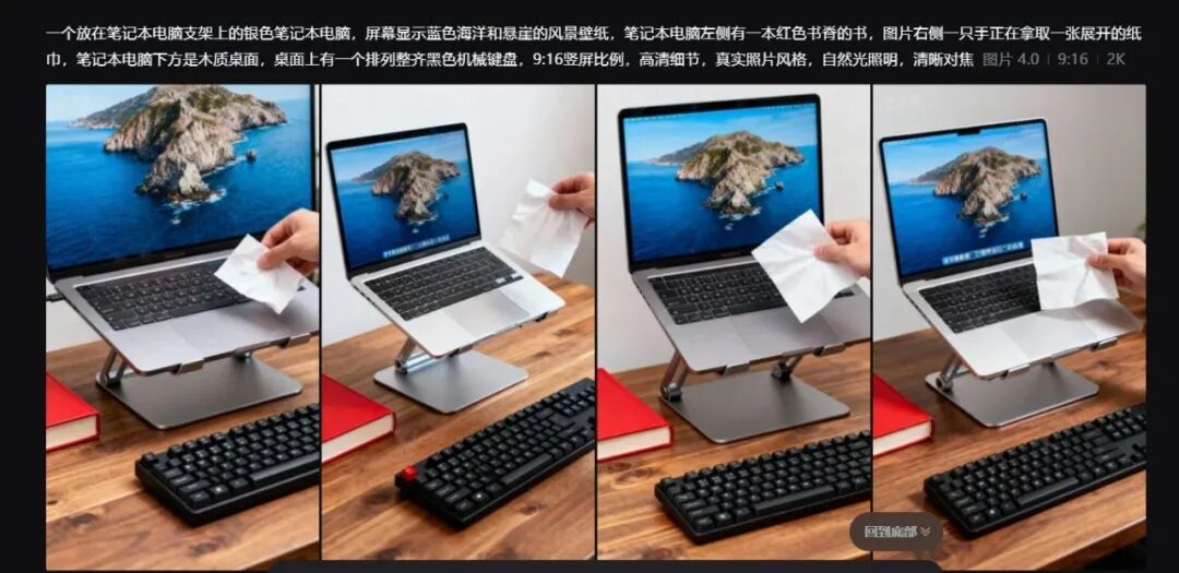 拿反推的咒语贴进生图区,模型切4.0、比例锁9:16,直接爆出“人手抛纸巾落键盘”的底图。