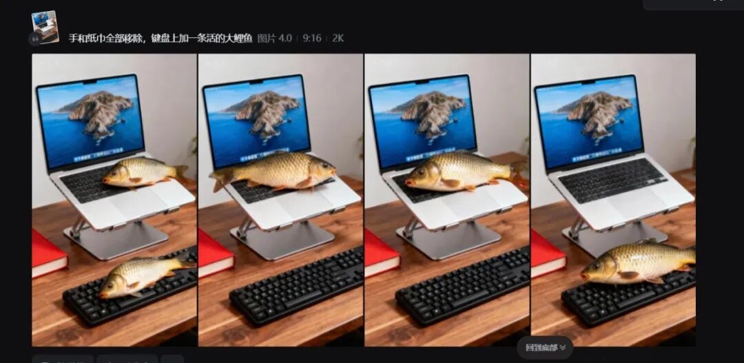 再把这图右键设成参考图,删掉提示词里手和纸巾的玩意,新贴“红鳞锦鲤破键跃出,半空甩尾带水花,超精细8K质感”,直接炼成鱼跃龙门神图。