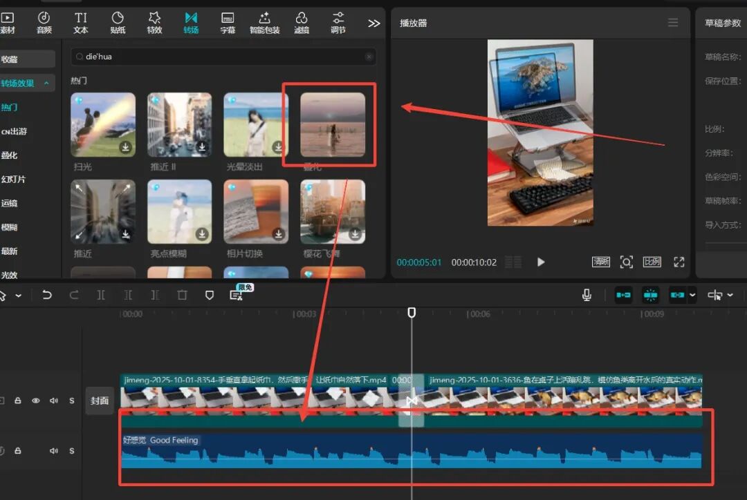 把两段视频拖上轨道怼一起,接缝处喂个0.8秒的叠化特效,BGM偷《大鱼》前奏古筝段。重点来了——导出前勾上“性能优先”,帧率飙到60才防卡成狗