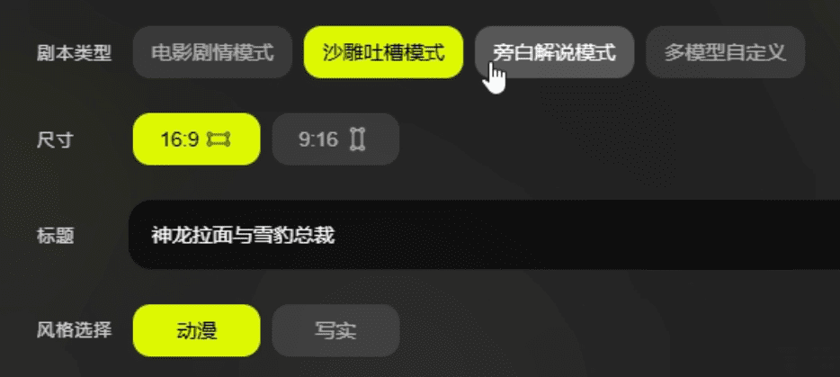 我了解到,其平台有针对性地强化了AI生成旁白的幽默感和吐槽文案的趣味性,在剧本生成类型上做了专门的区分,以生成“对味儿”的沙雕吐槽类型的解说漫内容。