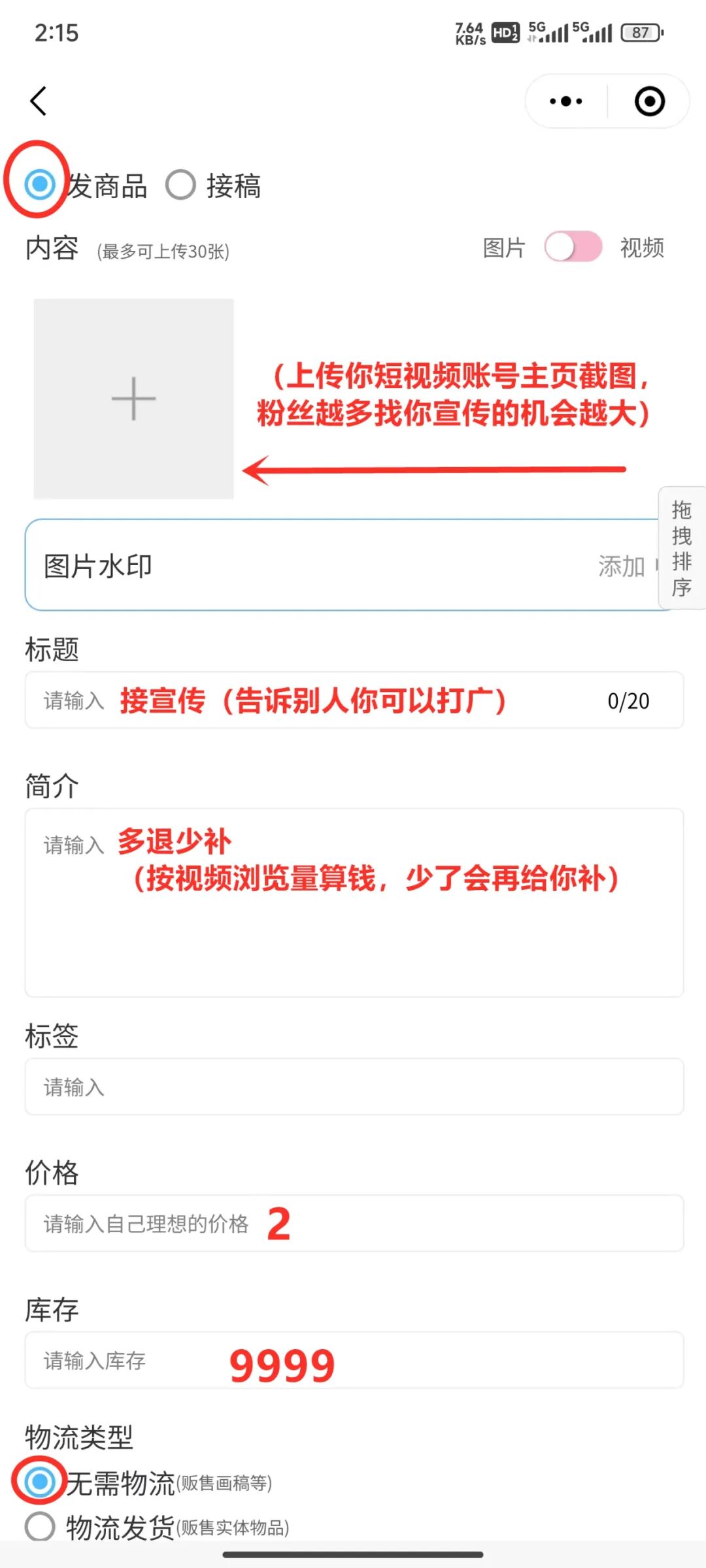 因为最近改版了,所以接广途径变了,首先打开小程序,点击中间“+”号,最下方找到“发商品”,通过防P问题,按以下要求填写(括号不用填)发布即可。