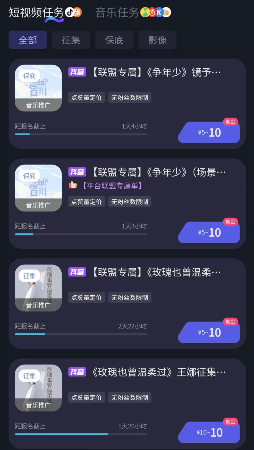 一个音乐接单推广平台,在抖音听听歌撸点收益很久了,适合剪辑技术好或者推广强的宝子。