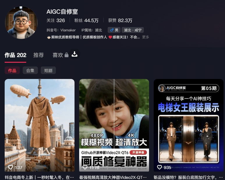 1. 制作AI生图提示词1、找视频教程打开你的抖音,搜一个AI教程,我常用的是抖音大神:AIGC自修室 咱们就用AIGC自修室的视频做演示吧,大家也可以关注一下博主确实厉害