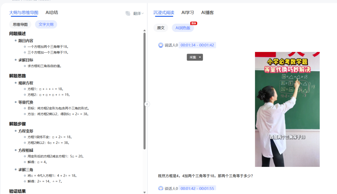 方程式她们也没学呢,难搞等量代换我自己也讲不明白,她也听不明白让她自己看讲解视频吧,得来回反复观看,看了后面忘了前面这时候【AI好记】就派上用场了,直接将视频上传到AI好记里面或者你的教程视频存在网盘里面的话,直接从网盘里面分享链接发送给它