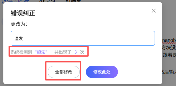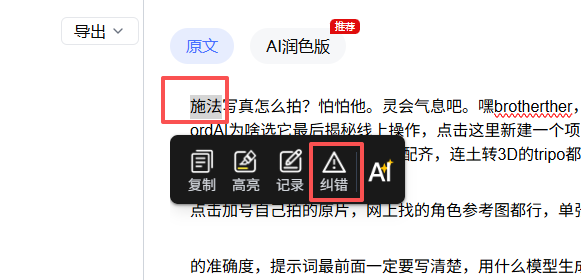 里面有错字的话,还能选择修改比如下面这个【施法】本来是【湿发】那就先选中这几个字,点击【纠错】