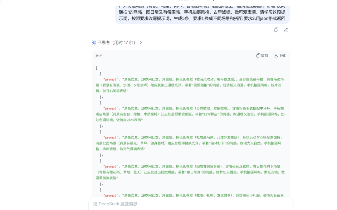 操作deepseek进行生提示词,核心主要是借助魔法指令来完成提示词输入和输出处理,为了方便大家进行解析文案,教大家一个小技巧,让它用json串来输出,提取超级方便