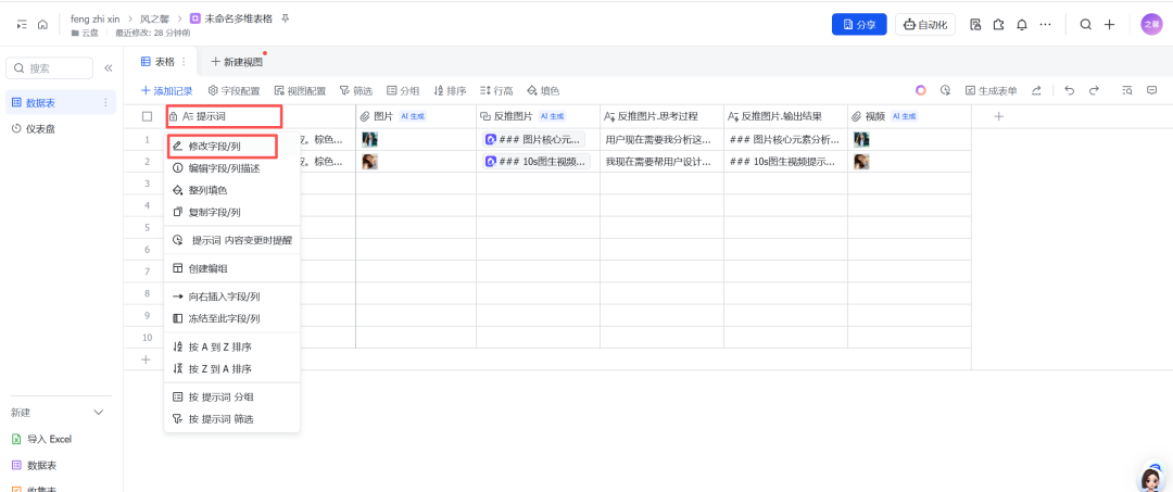 模式会有5列,可以点击每个列通过修改字段去调整属性或者名称,比如我想要的就是输入提示词,AI能帮我生成视频一整套