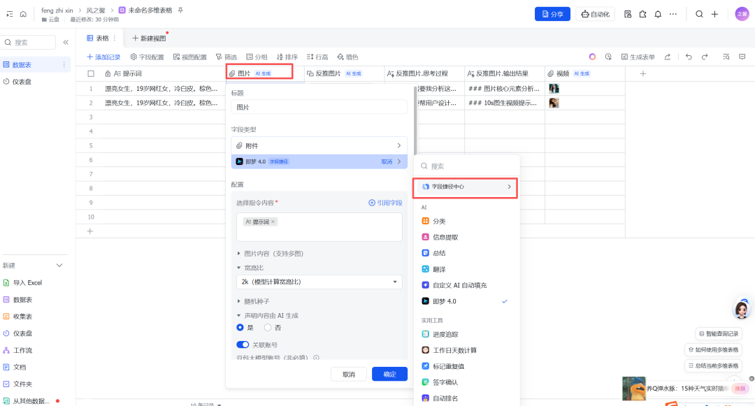 我的构思是这样子,输入提示词,AI根据提示词进行生图,借助豆包的视觉模型进行分析图片,根据图片内容生成图生视频提示词,最后借助豆包来进行图生视频。文生图怎么设置呢?选择这一列,点击修改字段,点击字段类型,选择字段捷径中心