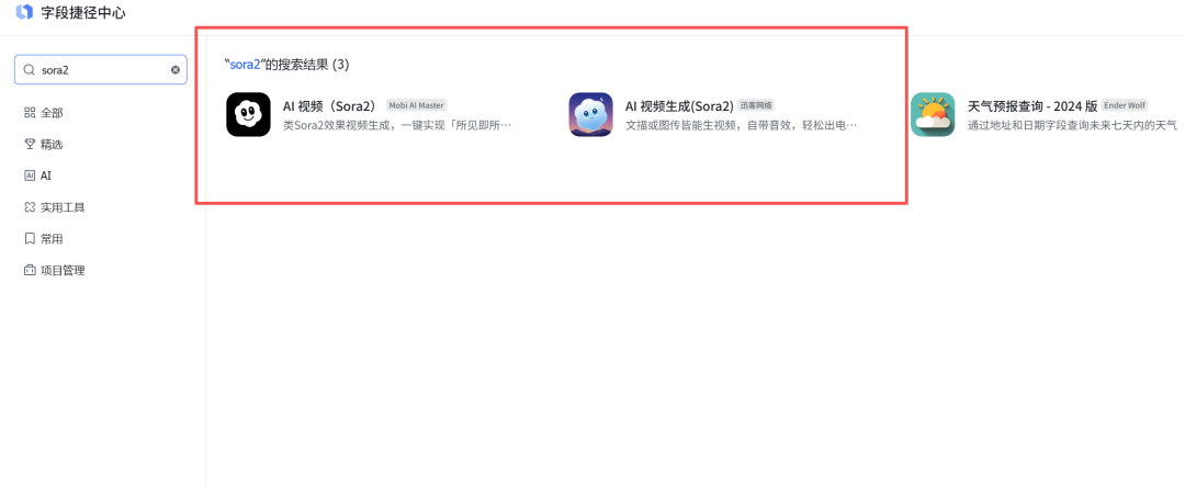 如果没有找到的,可以直接输入名称来查找,比如sora2,只要输入这个视频模型就能找到工具