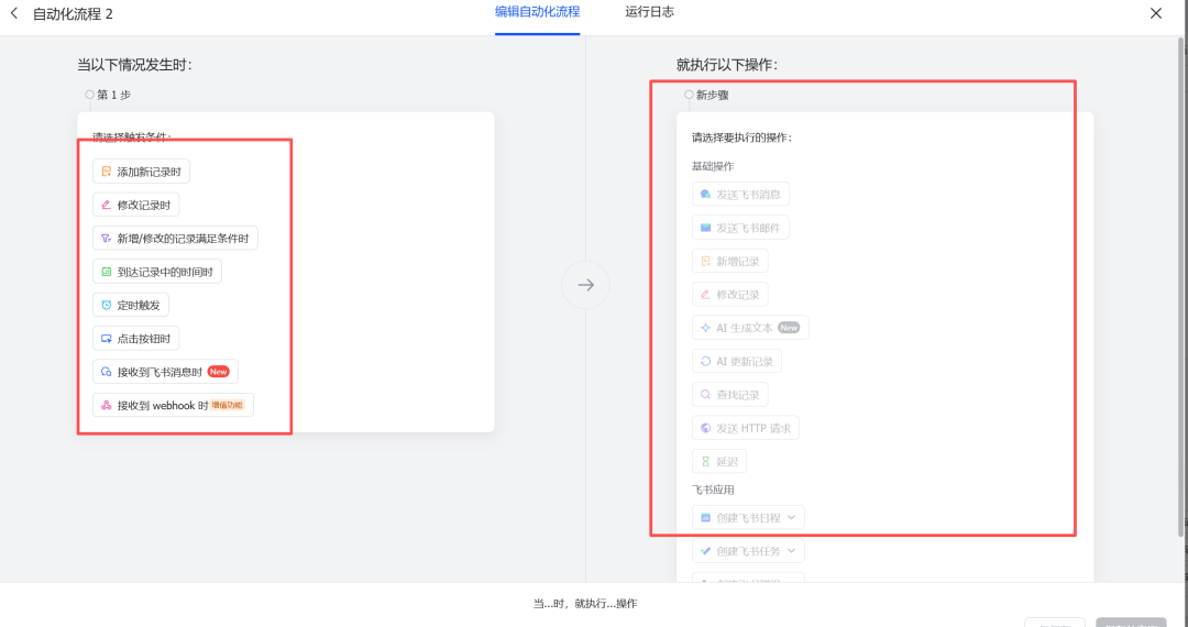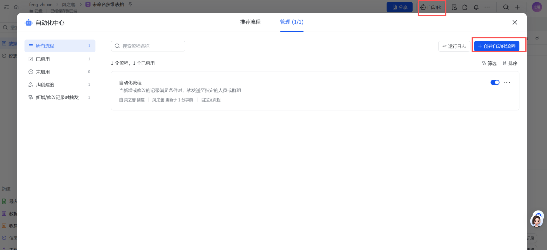 不得不说这整个工作流搭建起来还是比较快速的,那比如你想整个视频生成成功就通知你,还可以借助飞书的自动化,点击自动化,自已创建一个字段化