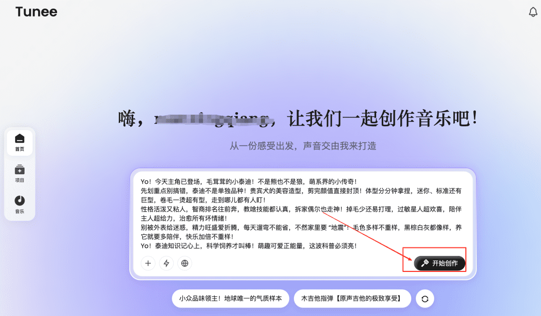 第二步:创作歌曲 前几天我介绍过一个网站,tunee,简单好用,每天送积分,生成的歌曲类型多样,非常符合现代人的审美。咱今天还是继续在tunee里面生成歌曲,打开网址:https://www.tunee.ai/zh-CN/home,然后将我们上一步制作好的歌词输入,点击“开始创作”,如下图所示: