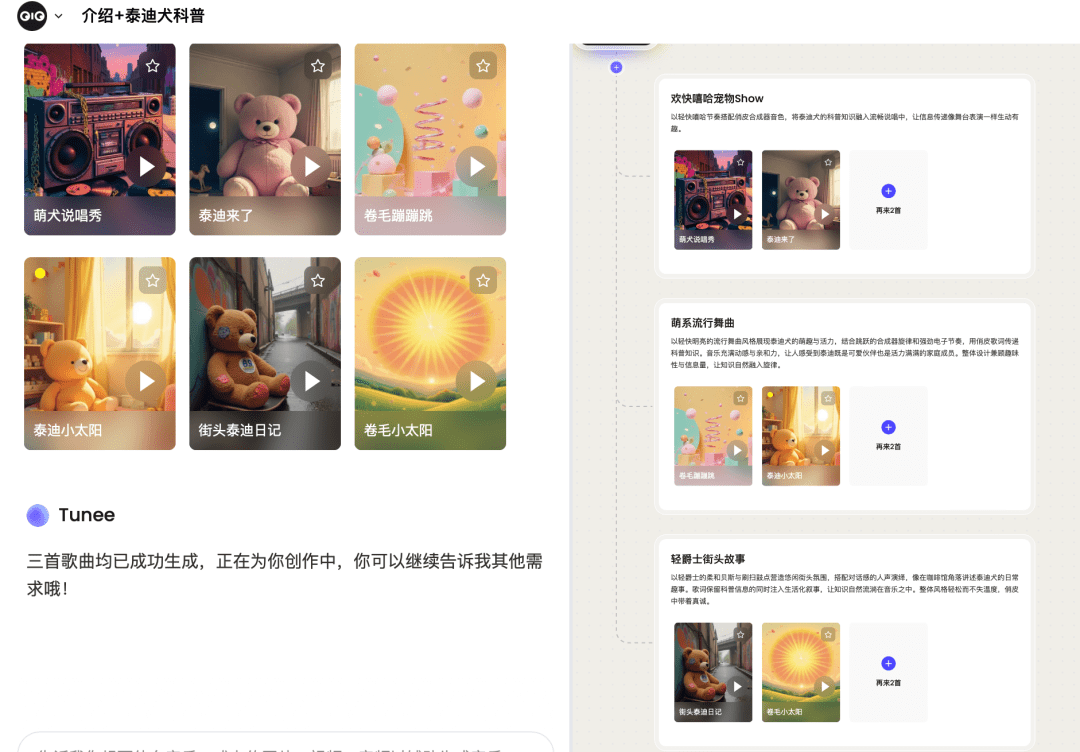 然后我们输入4,就代表“我全都要”,下面网站会开始创作,然后会给我们提供三种风格的原创歌曲。每个风格会给我们提供两首歌曲,下面看看tunee给我们生成的歌曲如下: