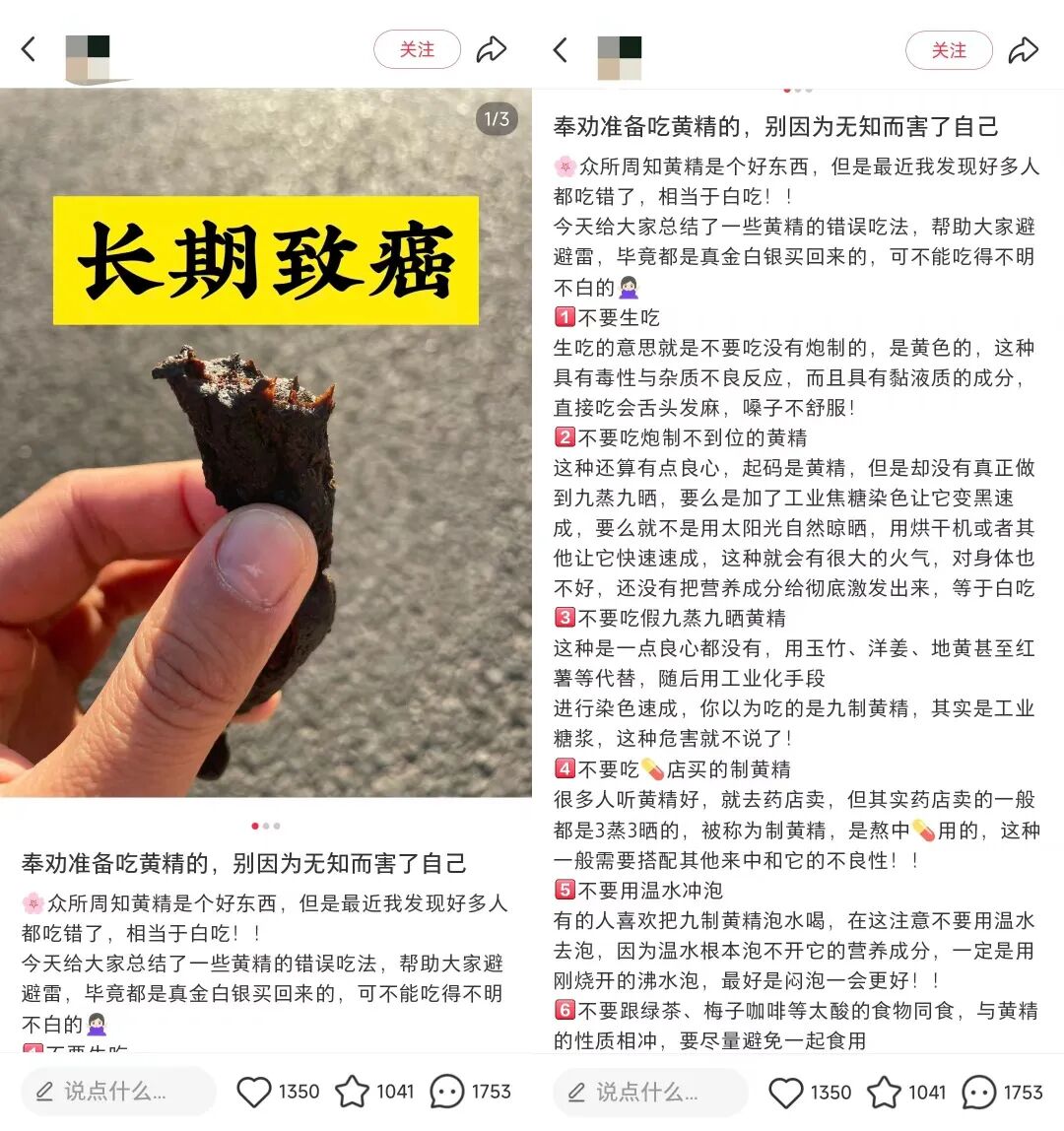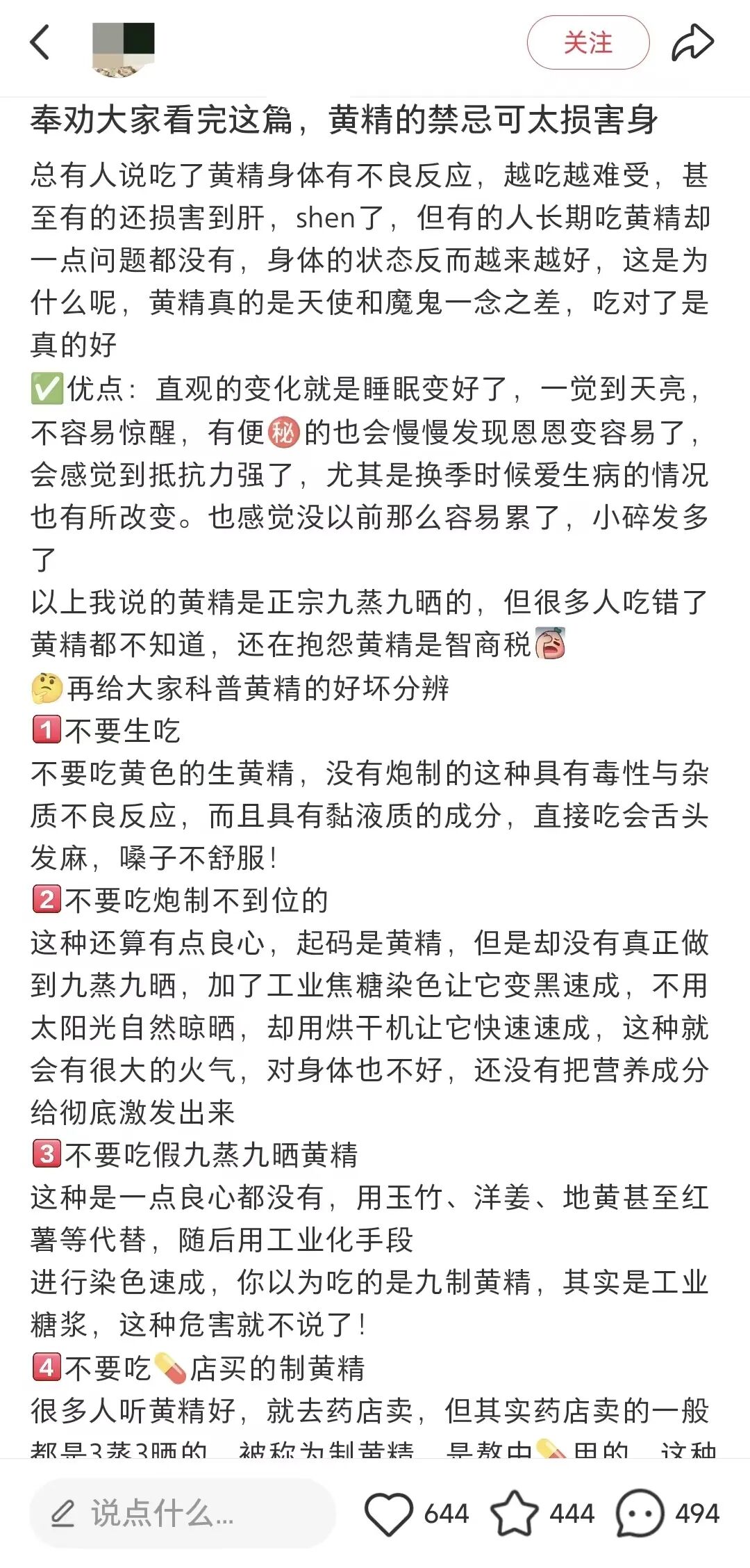 结果文案其实就是说了几种为什么有害的原因,吃法,吃的东西是不是正宗的,这个文案其实就是在教育用户要吃到好的黄精对的黄精。