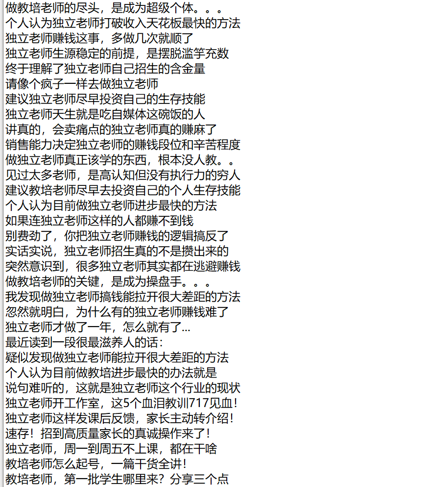 然后直接套用,这些下面就可以成为我们上面教练账号的选题,同样反过来上面的教练账号也可以成为这个独立老师赛道或者其他赛道的选题,万物即可借鉴,这种技巧晓晓洋讲的太多了,我课程里也是有各种不错的实操技巧去学的更深,比如说文案怎么做个智能体完美复刻这个号,达到给选题就生成自己风格的文案。