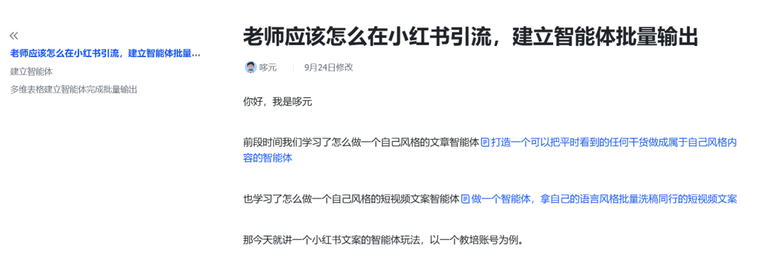 那晓晓洋自己的例子上面就讲到了,我就几个账号在小红书每天发 AI 产出的内容,这些内容都是我自己做好了智能体,我输入任意赛道的选题或者什么信息,他就能生成丰富的干货文,并且文案内有很多钩子话术,比如某某学员的案例,比如我教学员用了什么技巧等等,比如我是怎么做交付的流程,注意,我们就是要在干货文区轻微代入,而不是纯写干货,纯写干货就是工具人了。