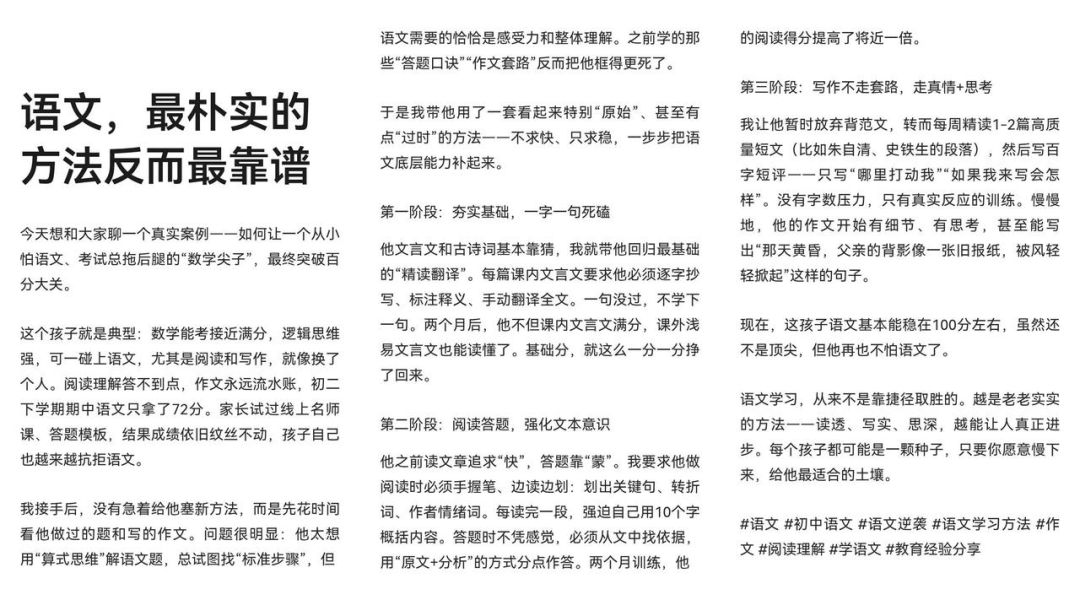再说一个之前讲过的教培例子,也是发这种干货文,来讲自己怎么辅导学生的,这里要注意,不要讲题,家长不看讲题。