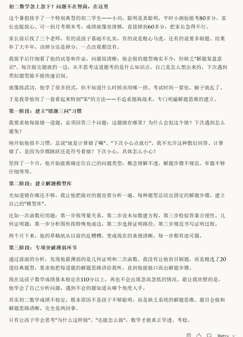 也是教大家做了智能体,比如下面这篇就是一个数学老师的文案。