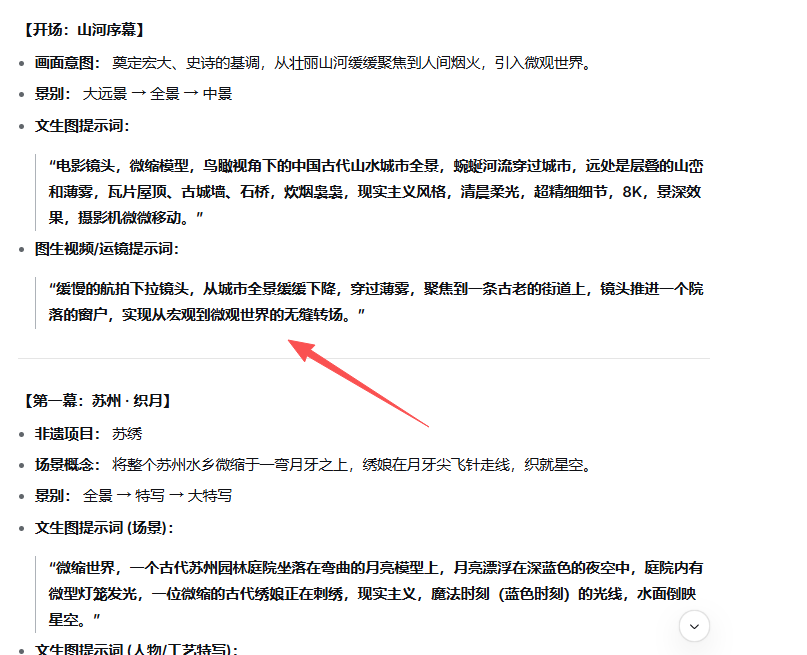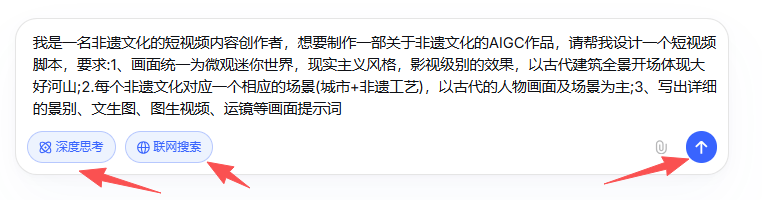 第一步,打开deepseek,打开深度思考和联网搜索,粘贴口令词口令词:我是一名非遗文化的短视频内容创作者,想要制作一部关于非遗文化的AIGC作品,请帮我设计一个短视频脚本,要求:1、画面统一为微观迷你世界,现实主义风格,影视级别的效果,以古代建筑全景开场体现大好河山;2.每个非遗文化对应一个相应的场景(城市+非遗工艺),以古代的人物画面及场景为主;3、写出详细的景别、文生图、图生视频、运镜等画面提示词