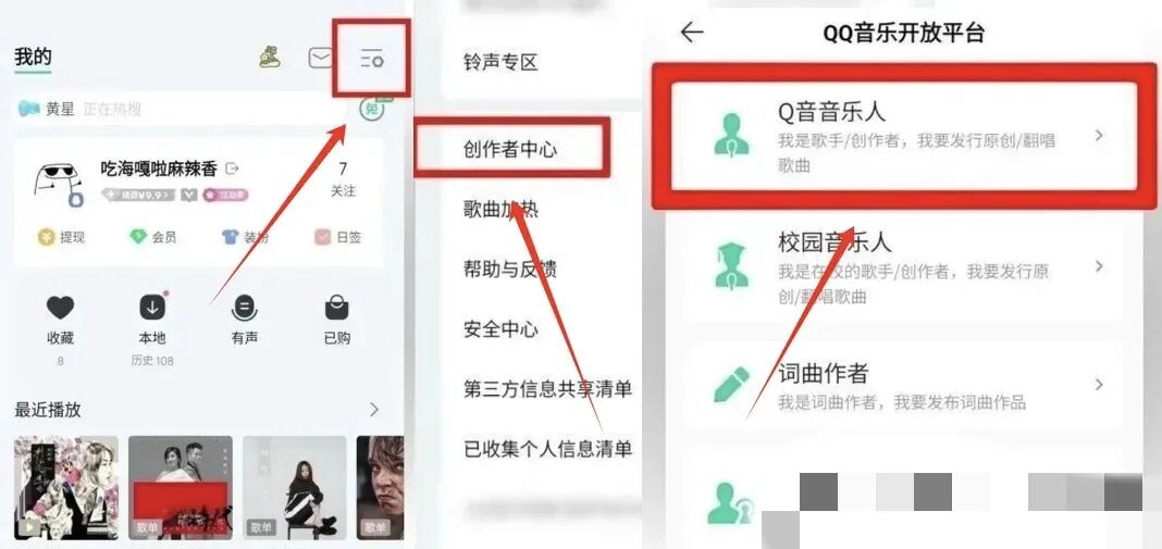 第一个QQ音乐全程Ai生成,不会唱歌也能出新歌曲,变现方式是发布新歌获得激励奖励。下个QQ音乐,开通音乐人权限。点App右上角三条杠,进入创作者中心,选择第一个“Q音3音乐人”开通。