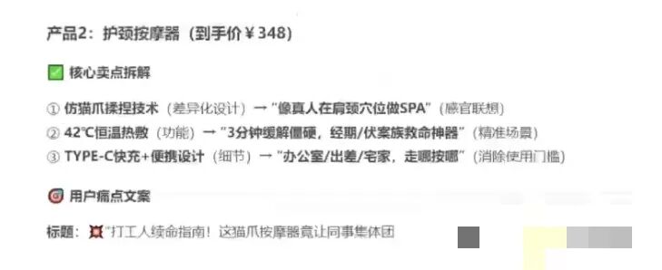 选好品后,文案咋写?接下来让deepseek帮你写就行,输入指令“帮我根据某某产品,生成相应的卖点分析+用户痛点文案”,全程无需动脑,