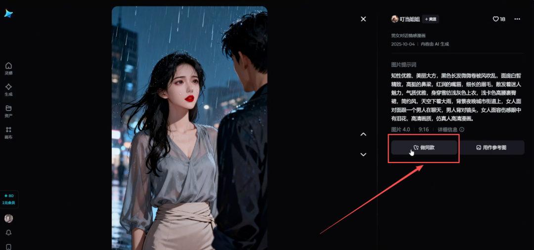 挑选一个满意的模板,点击 “做同款” 生成图片,从生成的图片中挑选一张,选择数字人功能,将文案导入生成视频