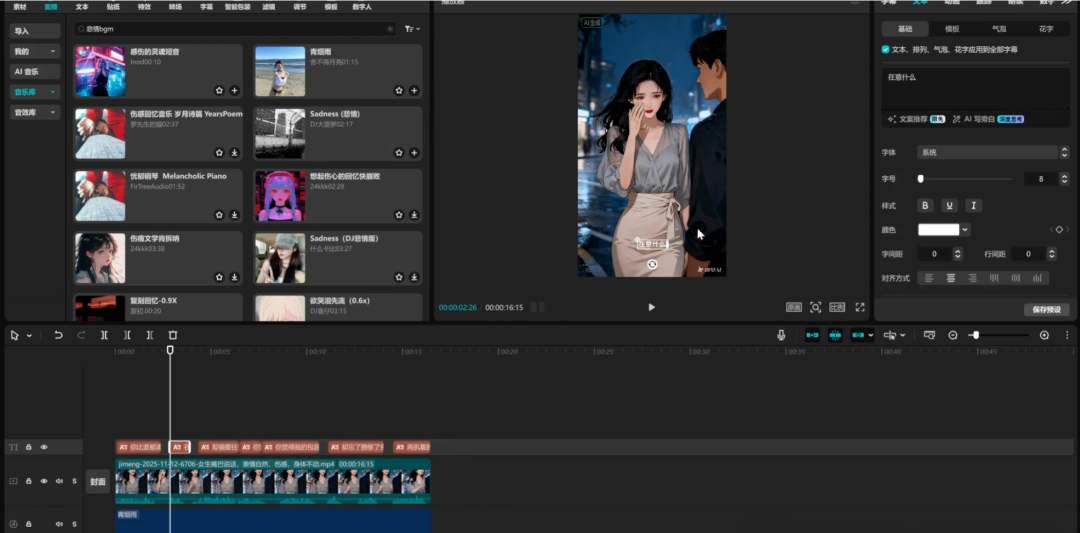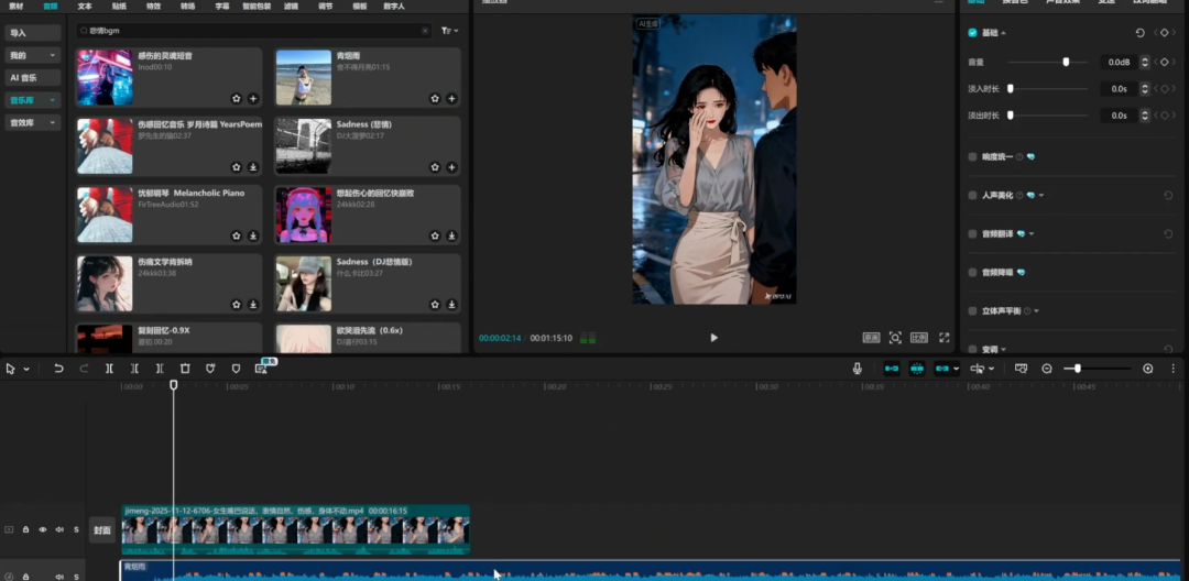 搜索 “悲情 BGM”,选择合适的音乐添加到视频中,并根据效果调整音量大小,删除多余音段