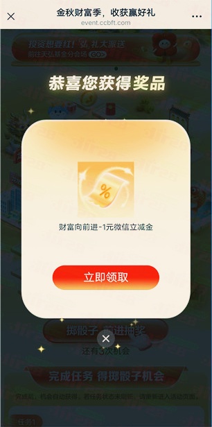 正文 建行金秋财富季掷骰子小游戏,抽1-188元微信立减金 首码推荐 V管理员 /今天 /172 阅读 1118 建行举办的金秋财富季抽最高188元微信立减金活动,打开微信进去活动里,完成简单的浏览任务可以获得多次抽奖机会,每天最多掷骰子抽奖5次,有机会中到1-188元微信立减金,小编测试中到1元秒到,全国建行卡都可以用,非必中。 微信扫下面码进入活动: 活动时间:结束日期未知 完成简单的浏览任务可以掷骰子抽奖多次,每天最多抽奖5次,刚中1元,非必中。 投诉/删帖