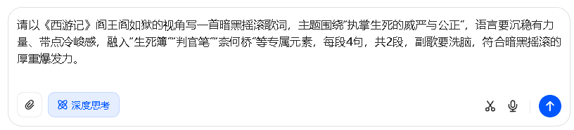 接下来是保姆级教程:3 步做出三国演唱会视频 ——步骤拆到不能再细,提示词直接给,小伙伴们复制就能用~1.豆包写歌词——1分钟出“阎如狱专属”歌词2.海绵编曲——3分钟让阎如狱“开口唱歌”3.即梦做视频——30秒让阎如狱“亲自”对口型4.剪映合成——5分钟搞定成品,直接发布1.豆包写歌词——1分钟出“阎如狱专属”歌词第一步生成歌词打开豆包APP,直接复制下面的精准提示词(宝子们换角色时,把“阎如狱”换成对应角色即可):请以《西游记》阎王阎如狱的视角写一首暗黑摇滚歌词,主题围绕“执掌生死的威严与公正”,语言要沉稳有力量、带点冷峻感,融入“生死簿”“判官笔”“奈何桥”等专属元素,每段4句,共2段,副歌要洗脑,符合暗黑摇滚的厚重爆发力。